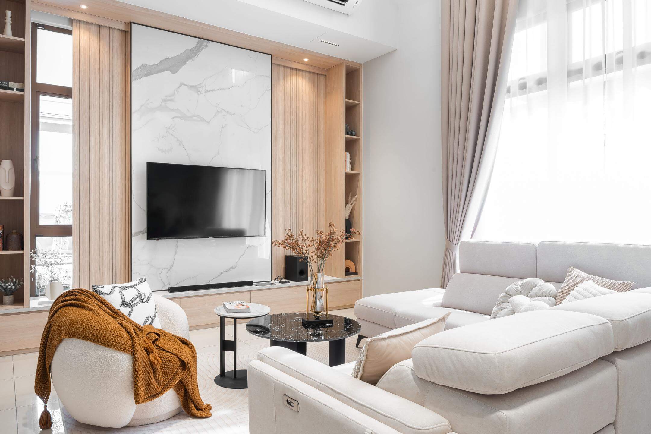 In this space, clean lines and uncluttered spaces create a sense of calm and serenity. The color palette is deliberately subdued, with neutral tones like soft whites, muted grays, and warm beiges dominating the scheme. These colors not only evoke a feeling of peace but also allow the natural materials used in the design to shine.
