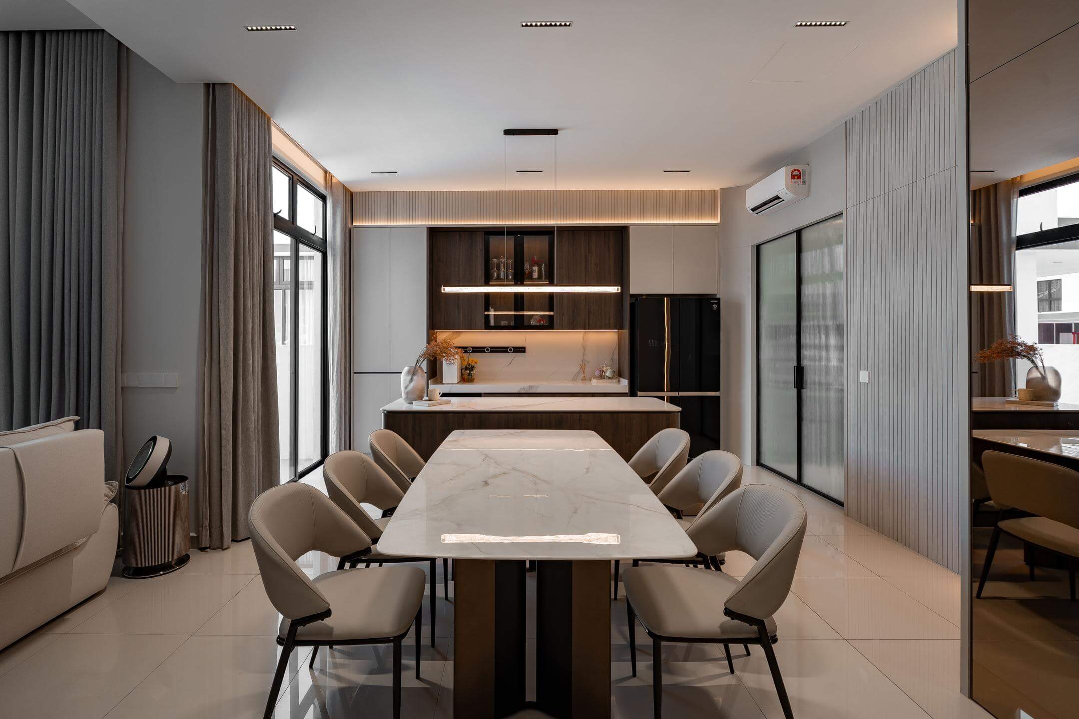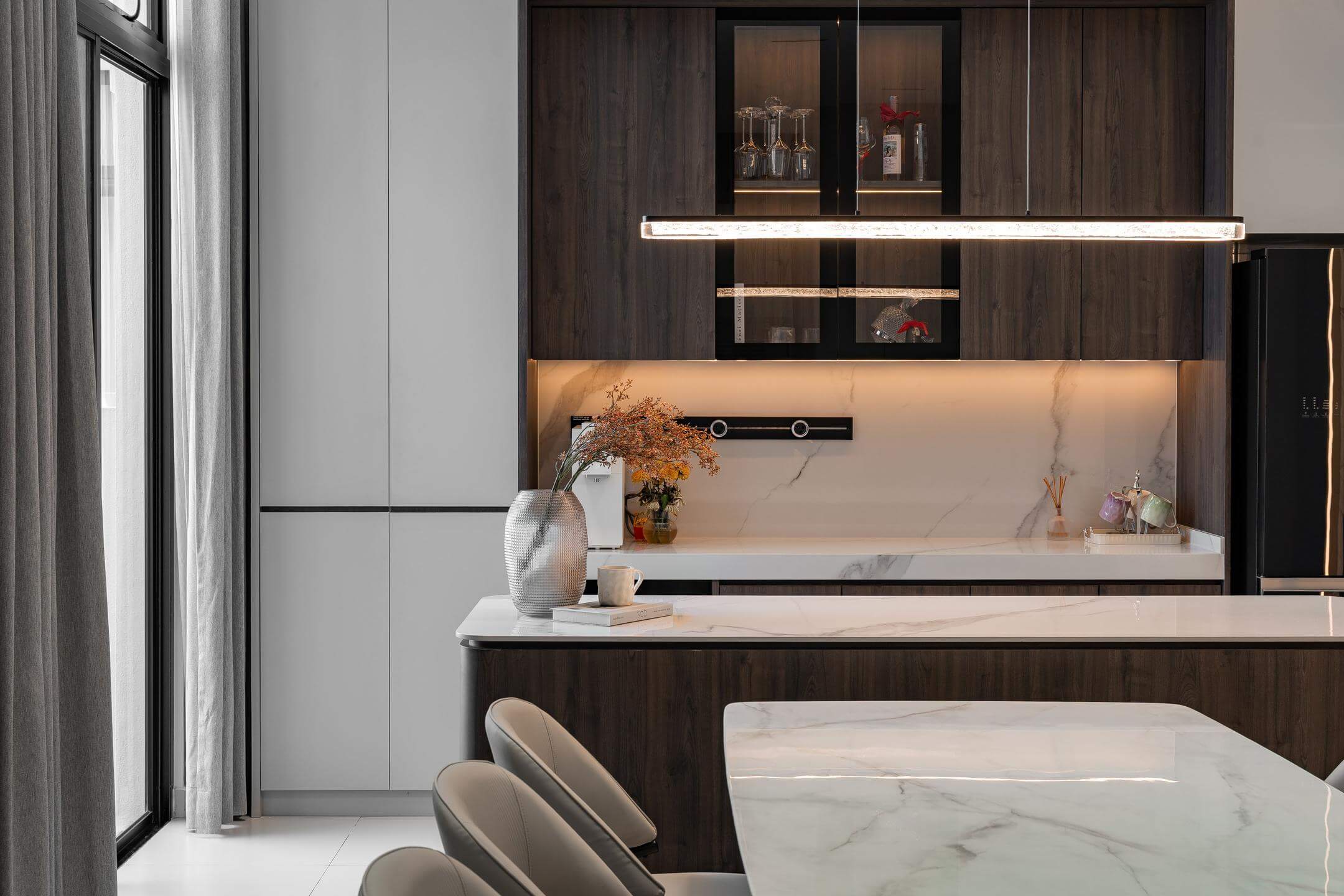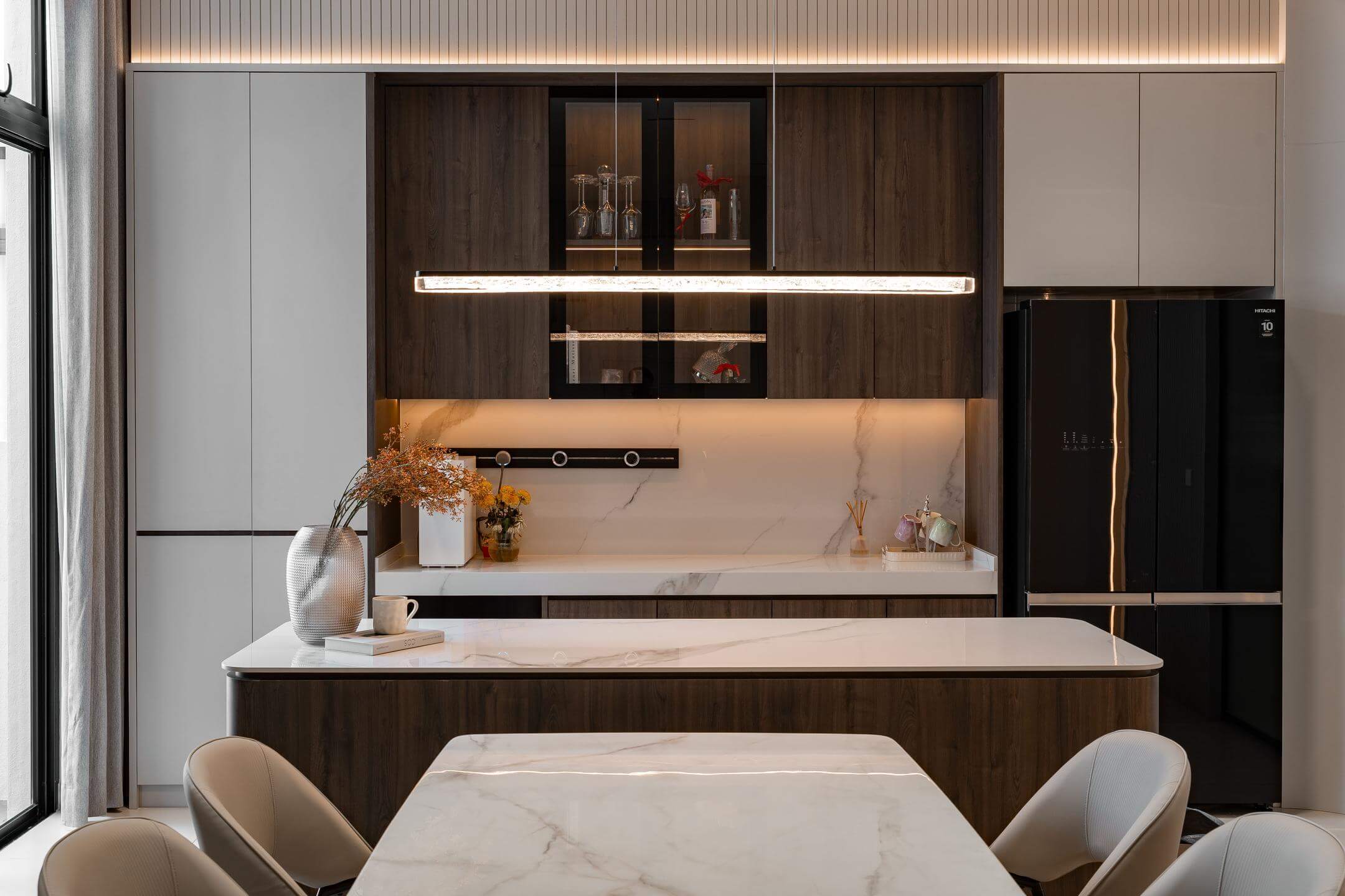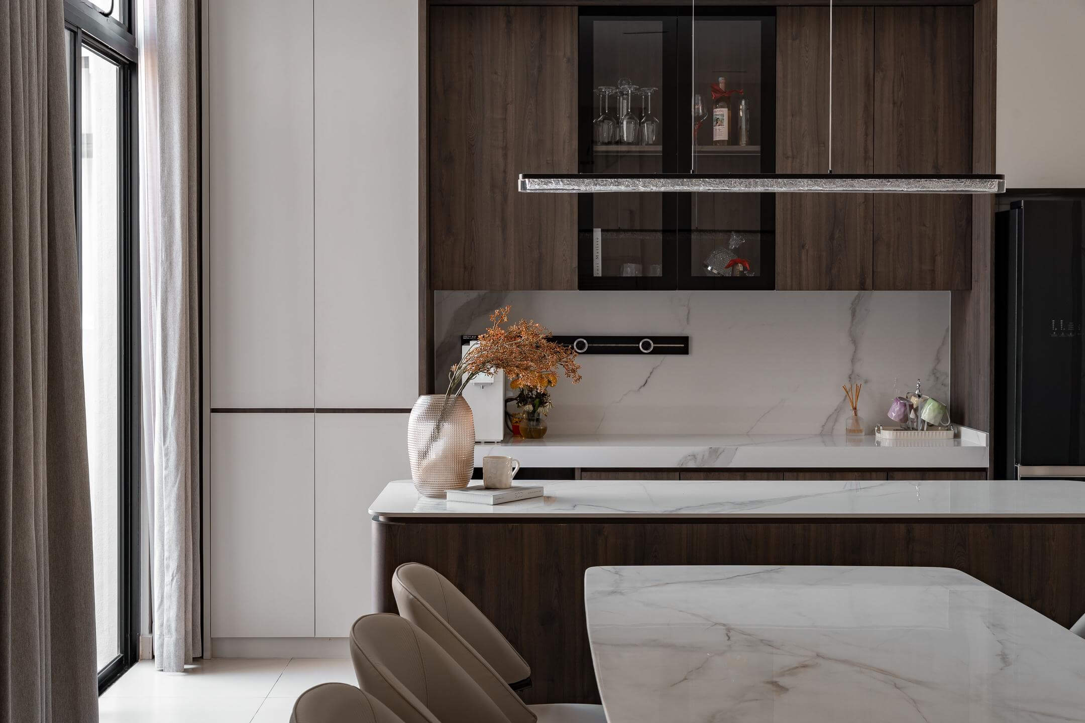 Warm dark wood tones, soft grey hues, and understated accents come together to create a space that speaks not loudly, but deeply. It is a home that feels composed — serene in its simplicity, and powerful in its restraint.