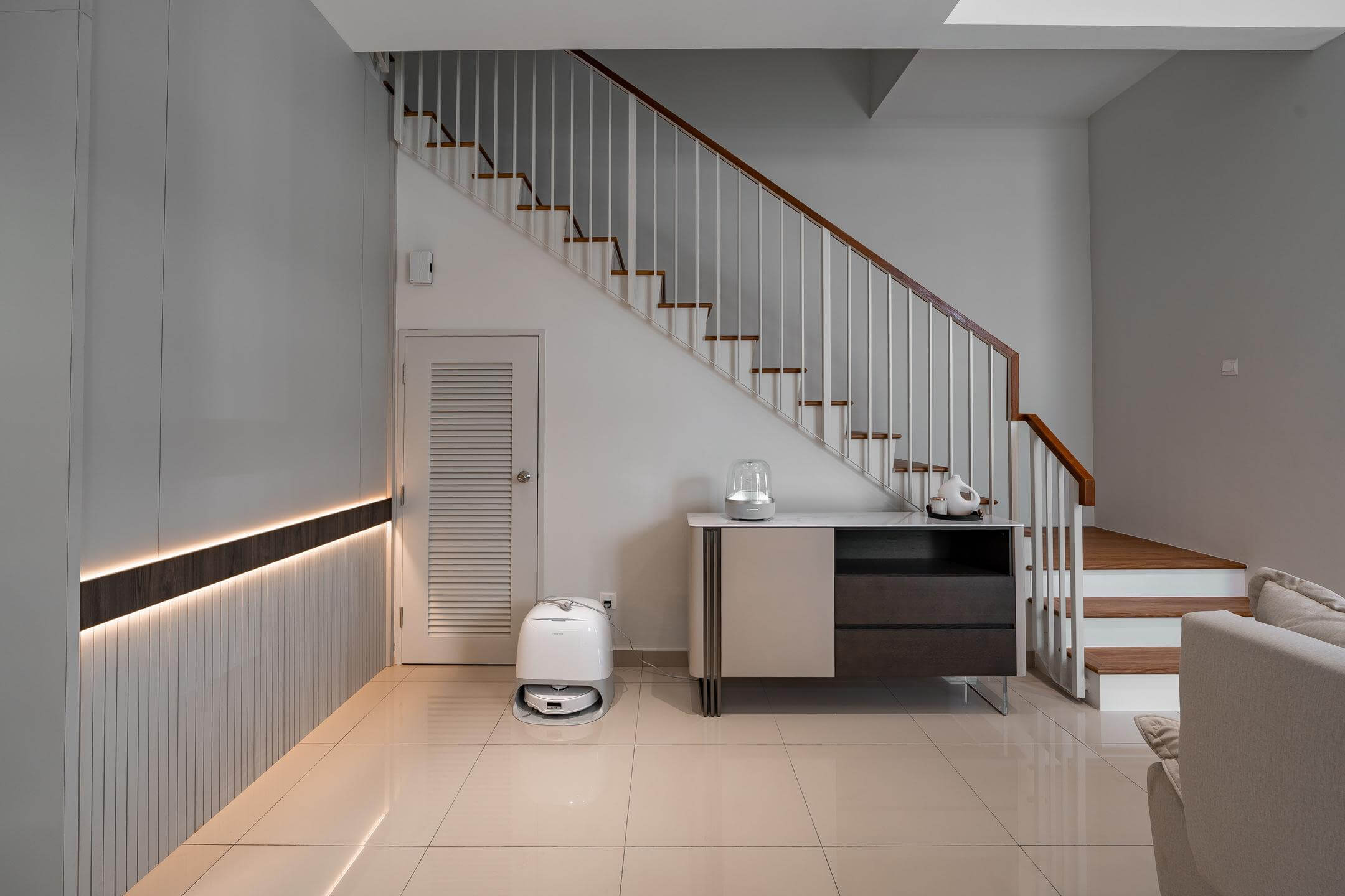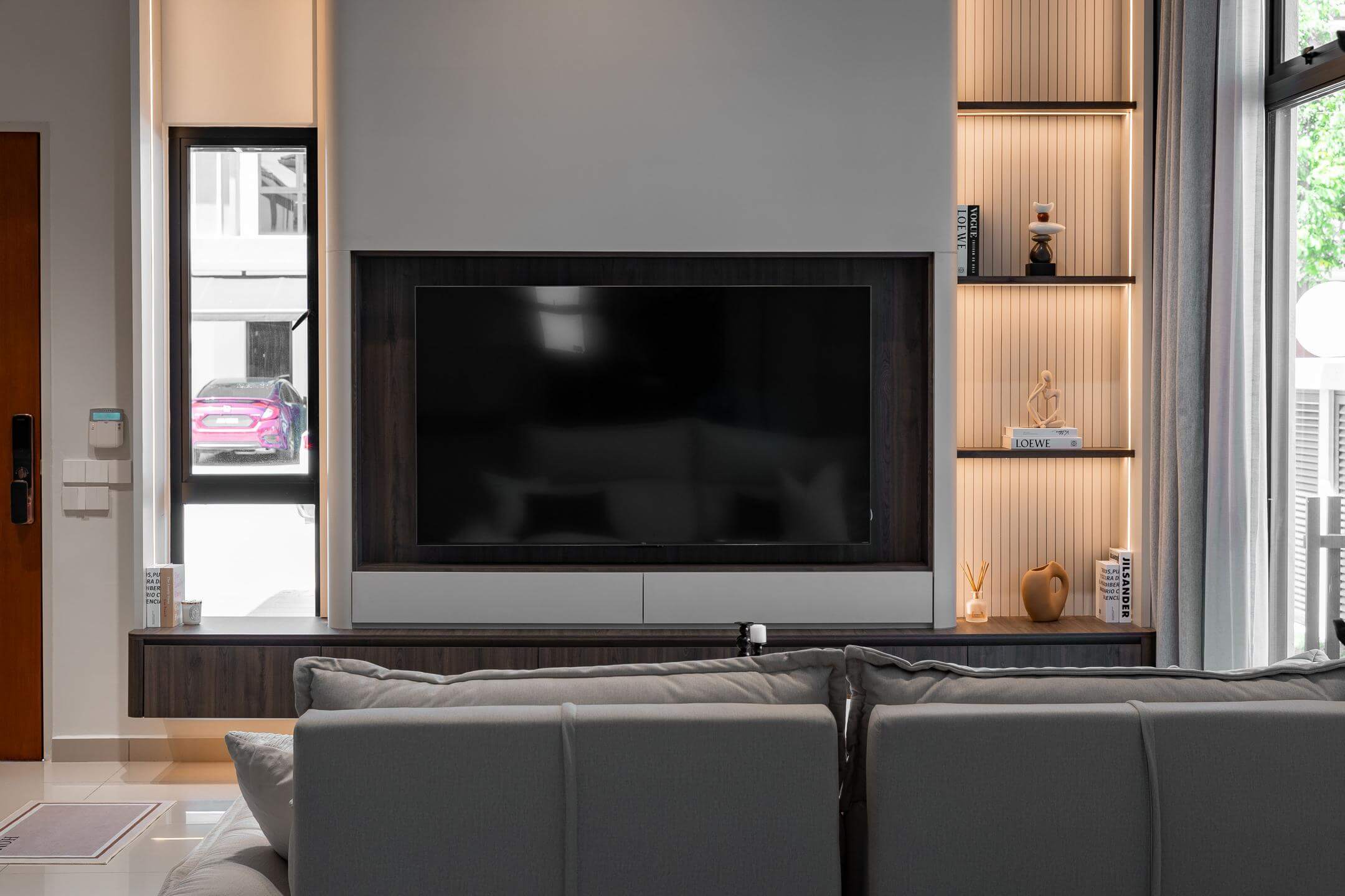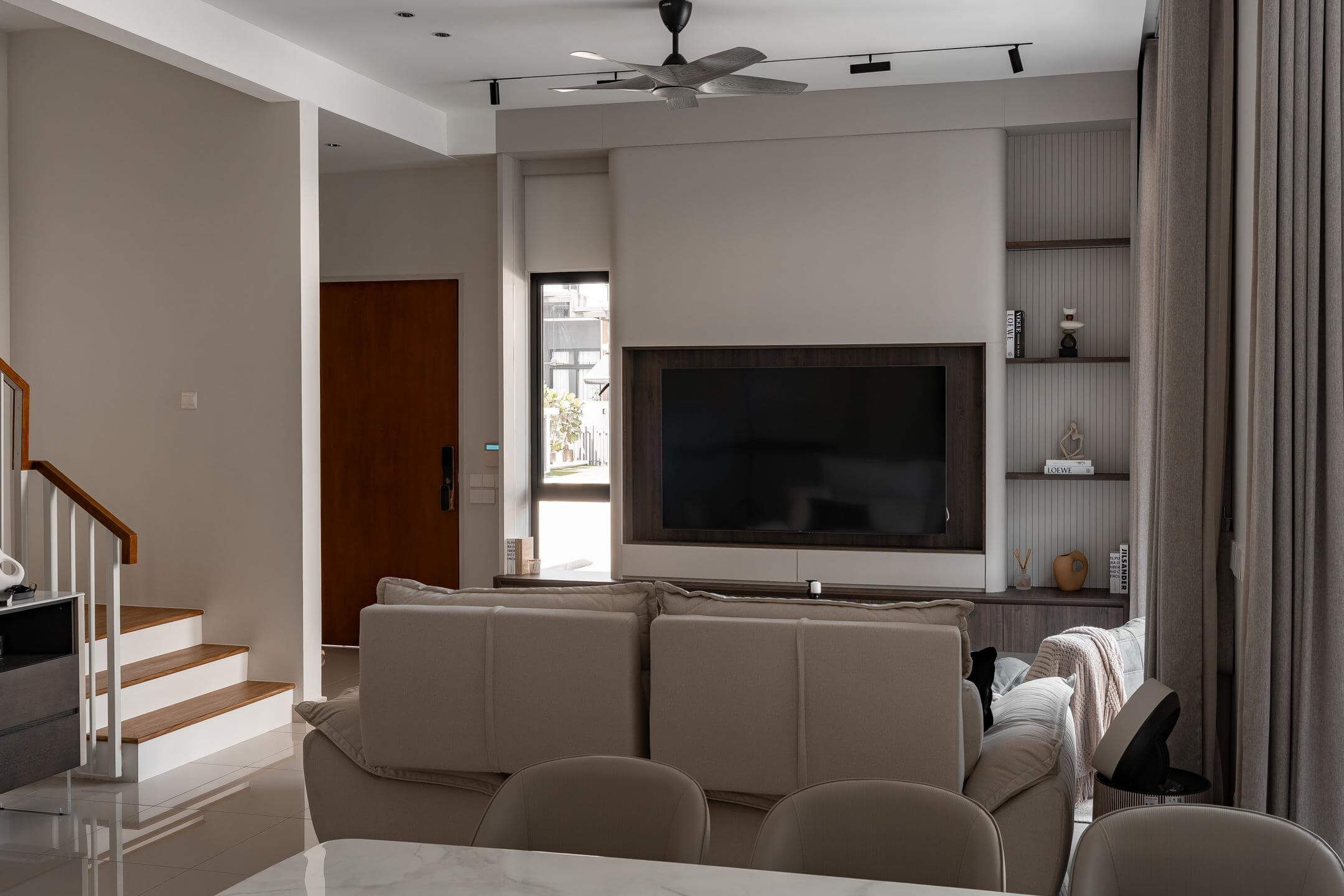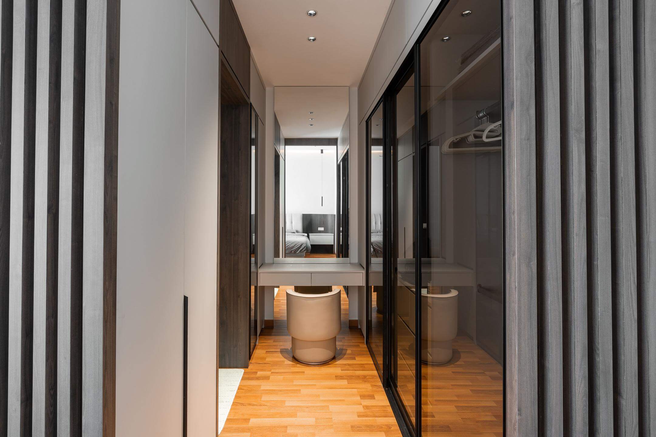 Warm dark wood tones, soft grey hues, and understated accents come together to create a space that speaks not loudly, but deeply. It is a home that feels composed — serene in its simplicity, and powerful in its restraint.